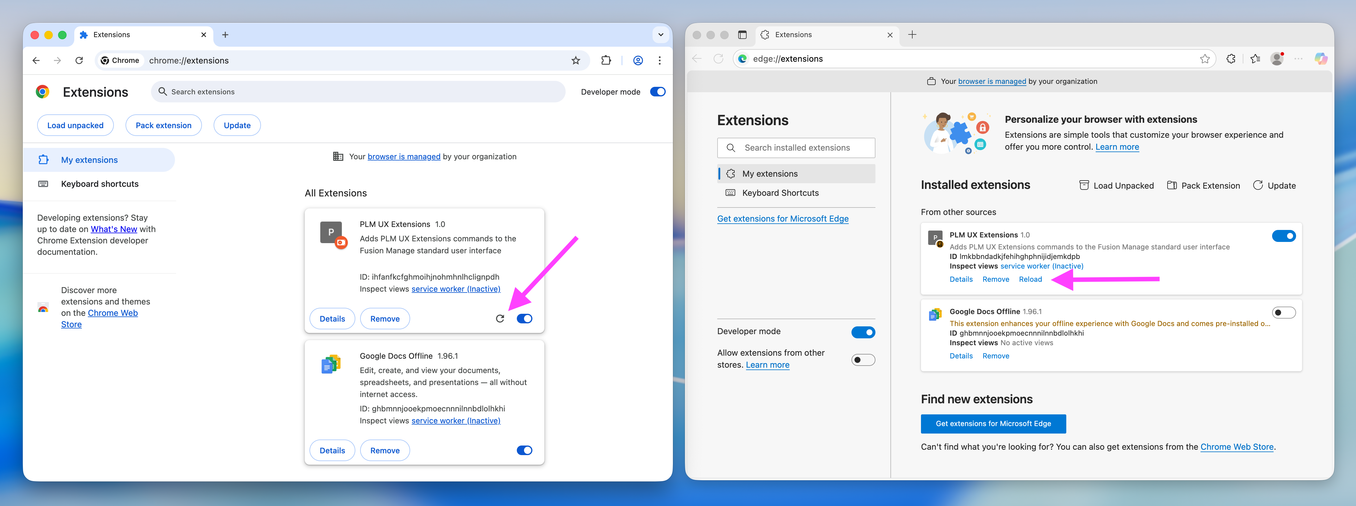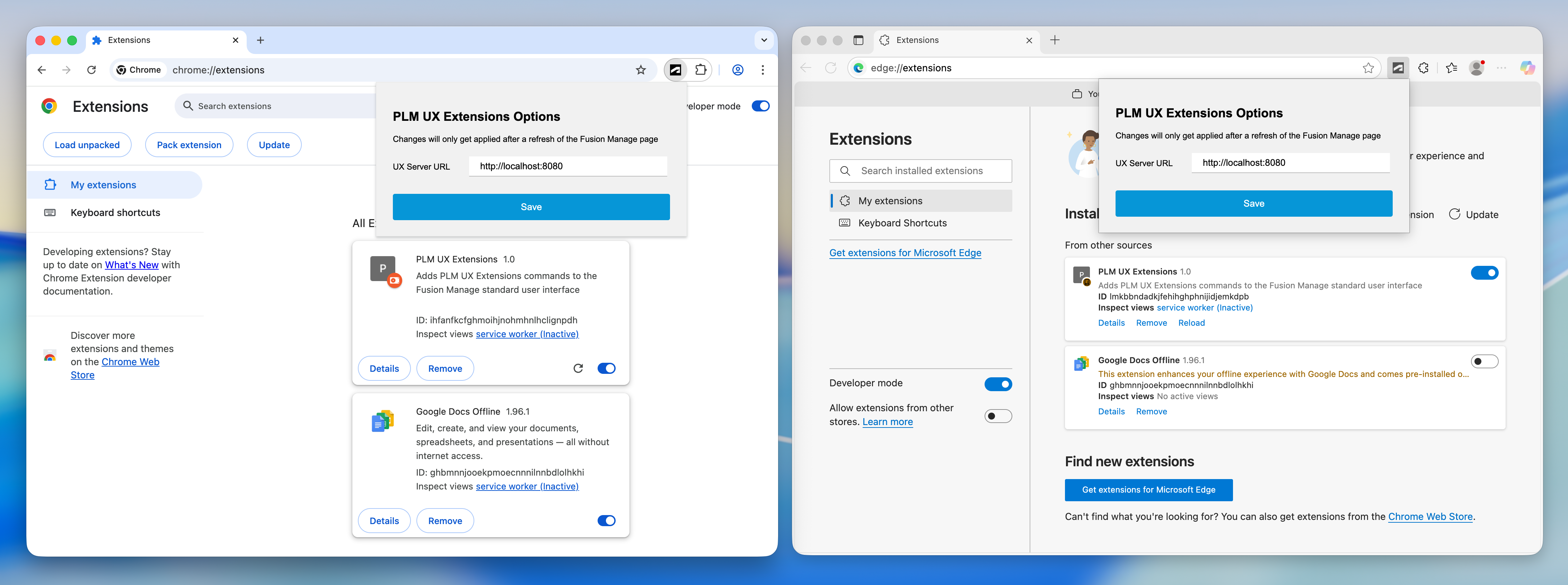 Note that all changes to the files in folder /chrome require a relaod of the given extension. For example, if you change the default PLM UX Extensions server URL in file content.js, you have to return to this list of extensions and enforce a reload using the given controls: