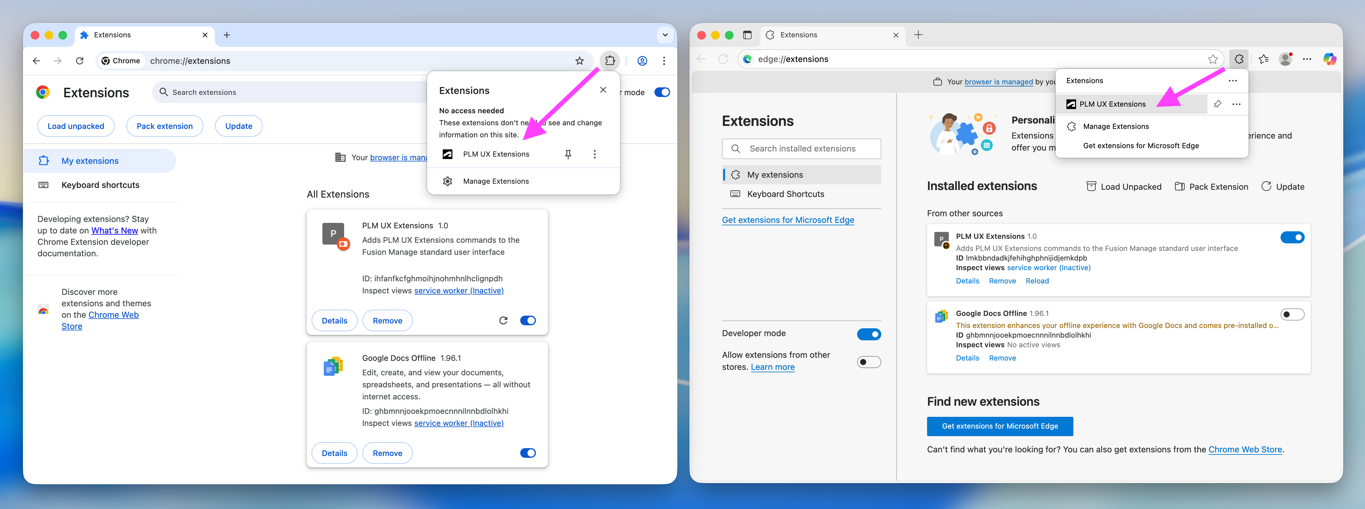 Once the Chrome Extension is installed and active on your computer, you can open the extension's options by clicking the browser's Extensions button and then clicking the PLM UX Extensions in the list of browser Extensions: