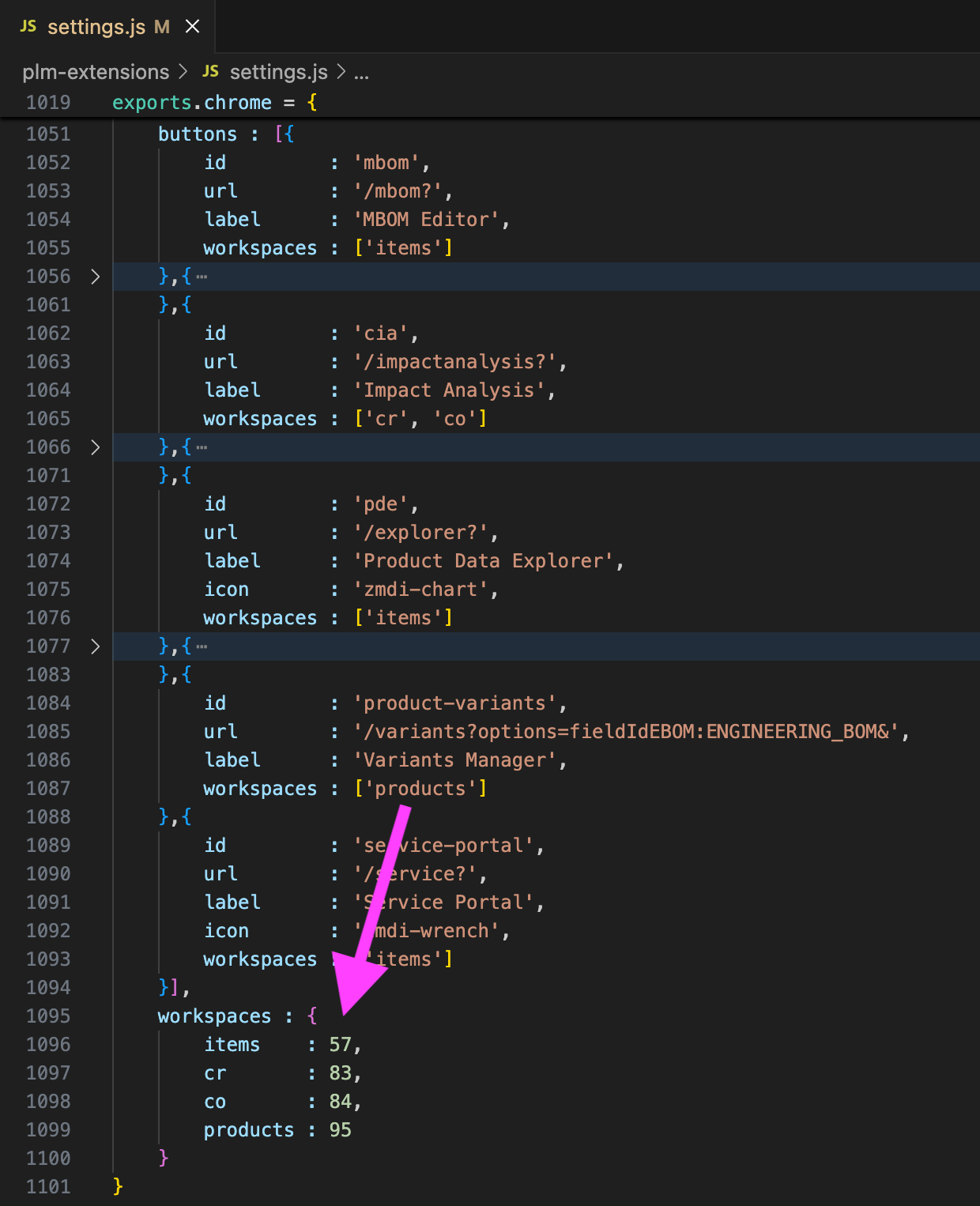 | workspaces | Visibility of the button is controlled by this settings. Each value listed in here will be mapped to the matching workspace ID using the property workspaces that follows the list of buttons. |